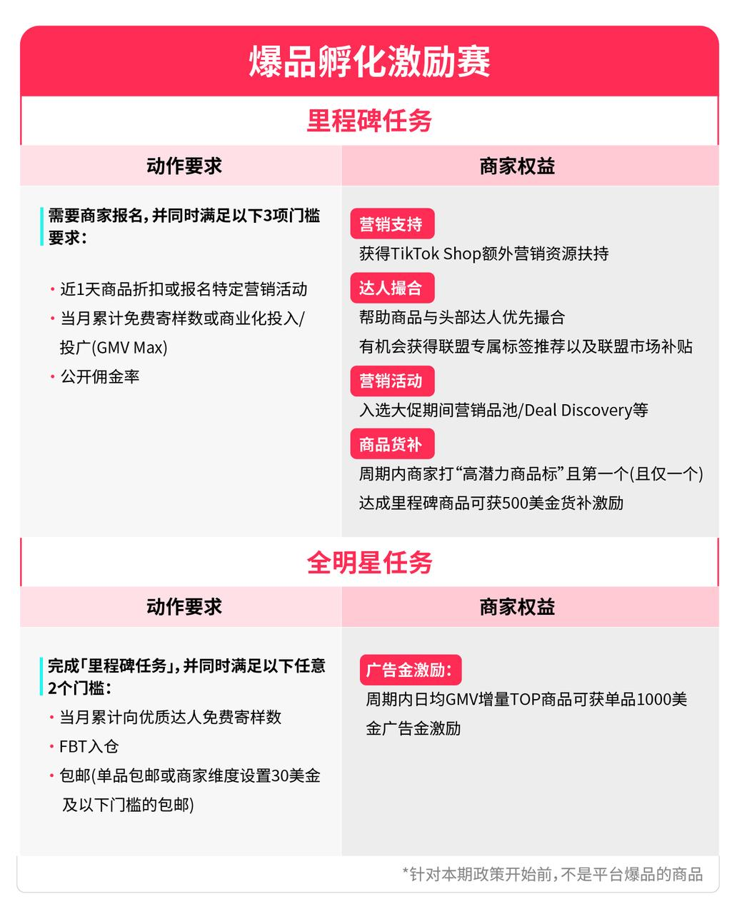在明确商品成长节奏的基础上,针对跨境自运营(POP)商家新品冷启,将获得平台提供的广告金激励与专属曝光,有效降低新品冷启成本。同时,平台更特别推出爆品孵化项目,不仅专门提供折扣设置、免费寄样、投广、佣金率等任务,还提供专属奖励,助力潜力产品成长为爆品,参与该计划的跨境自运营(POP)商家GMV和曝光平均增长超过20%,部分商家的销售额甚至增长了两倍。商家报名爆品孵化项目,报名后完成如下所述对应阶段的任务,即可获得对应激励。